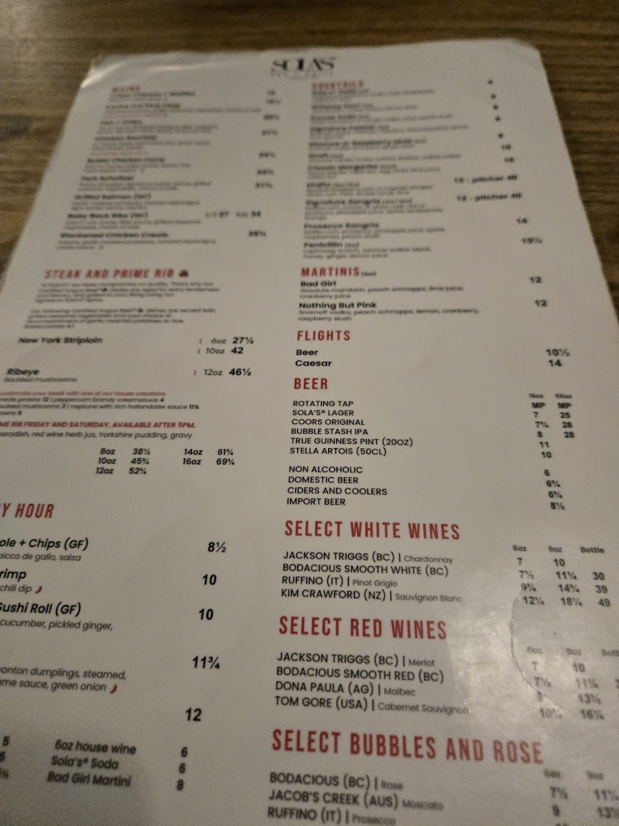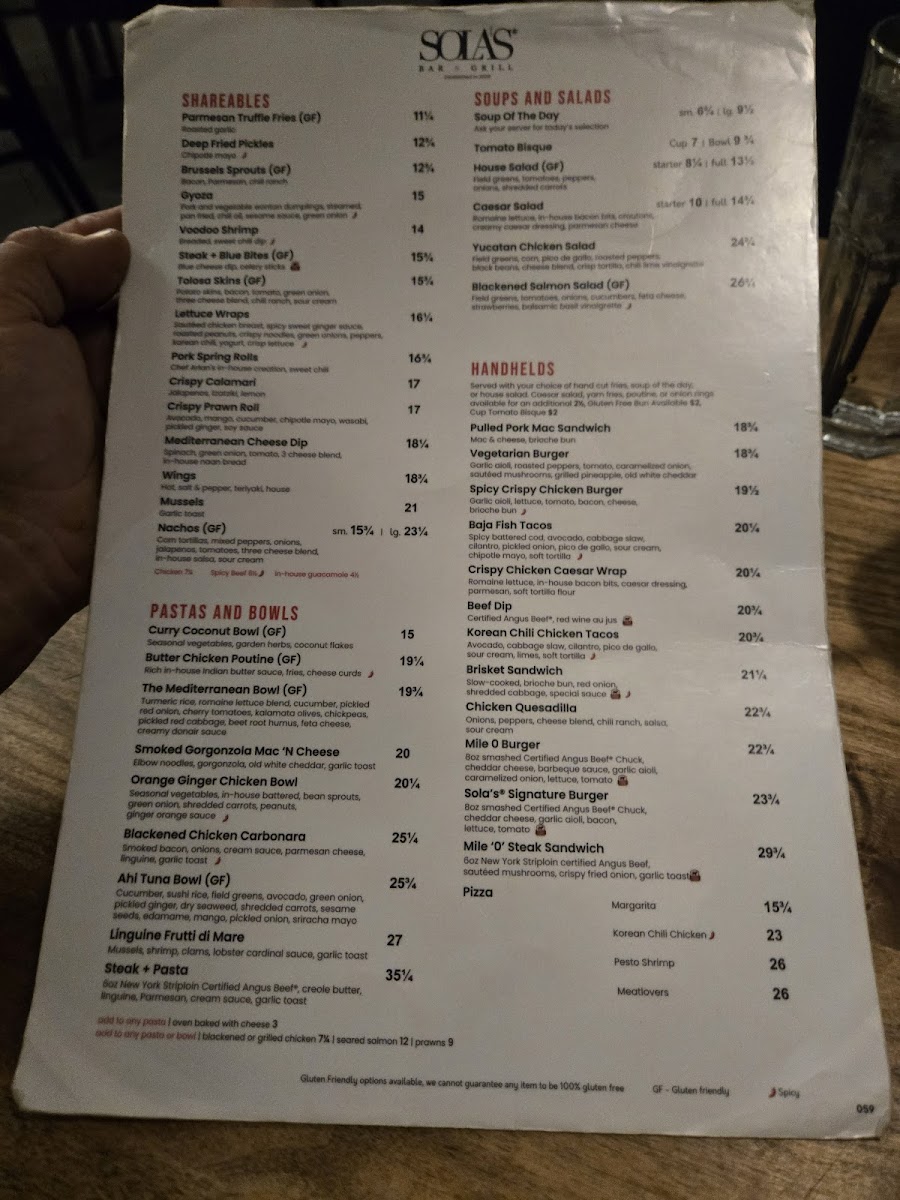 Sola's Bar & Grill offers a menu that strikes a satisfying balance between hearty comfort food and inventive pub-style dishes. The Turkey Reuben stands out with its perfectly toasted rye, tender turkey, tangy sauerkraut, and melted Swiss, delivering a classic flavor profile executed with care. Alongside, the menu features generous burgers, crisp salads, and shareable appetizers that showcase a mix of bold seasoning and fresh ingredients. Entrees are reasonably priced, reflecting both the quality and portion sizes, making it an approachable choice for casual dining. The kitchen also pays attention to detail in presentation, ensuring each plate looks as inviting as it tastes. Overall, Sola's menu successfully combines familiar favorites with small creative twists, offering something for both comfort-seekers and those looking for a flavorful twist on traditional dishes.